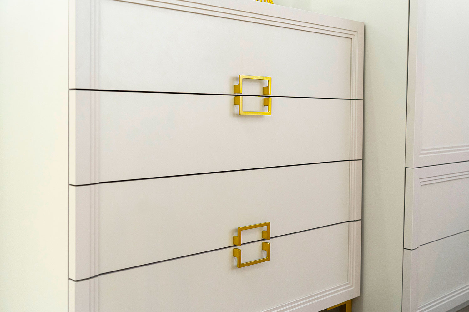 Элегантный лаконичный комод с четкими прямыми линиями будет превосходно смотреться в спальне, гостиной, прихожей, оформленной в стиле ар-деко или минимализм. Четыре выдвижных ящика визуально объединены рисунком квадратных ручек. Изящный сложный оттенок «серый кашемир», фурнитура и опоры «под золото» только усиливают эффектность мебели.