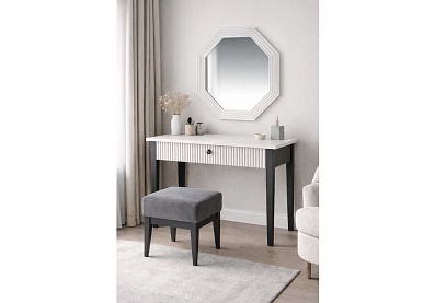 • Для хранения в спальне есть большой шкаф с зеркалом элегантного пепельного оттенка «графит», что придаёт дополнительный шарм коллекции;